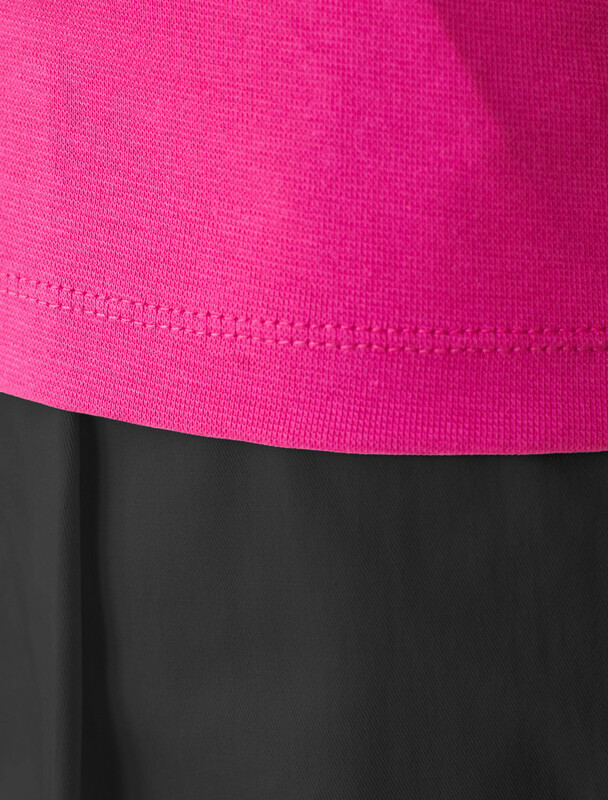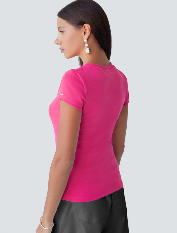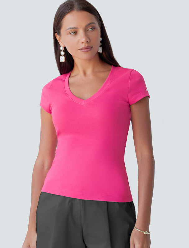 Облегающая футболка с V-образным вырезом цвета фуксия создаст утонченный образ. Идеальная базовая модель для вашего гардероба!  Глубокий V-образный вырез подчеркивает линию шеи и зрительно удлиняет силуэт. Футболка выполнена из хлопка с добавлением эластана, которая мягко облегает контуры тела, подчеркивая достоинства фигуры. Универсальный вариант для создания стильных повседневных образов.