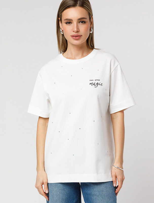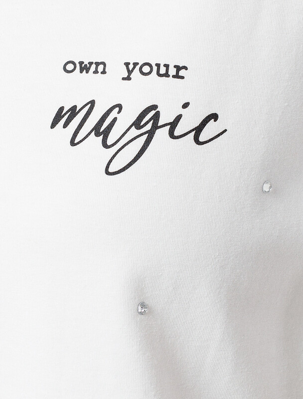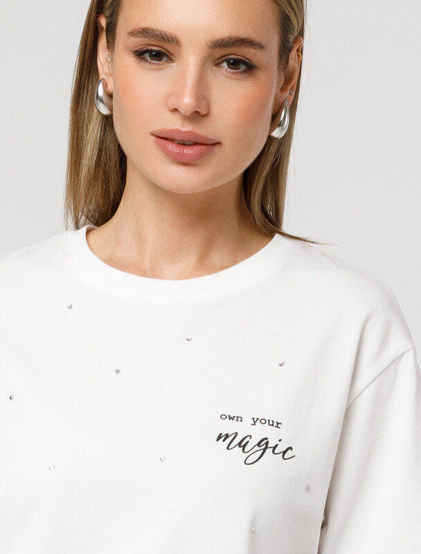Футболка свободного кроя выполнена из премиального хлопка.  Лаконичный принт нанесен красками с устойчивым покрытием и россыпью сияющих страз. Перевод: «Own your magic - Твори свою магию» Наличие эластана в составе гарантирует абсолютный комфорт и долговечность изделия. Модель дополнена металлическим логотипом бренда.