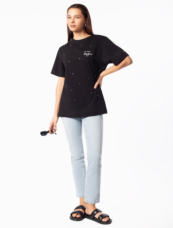 Футболка свободного кроя выполнена из премиального хлопка. Лаконичный принт нанесен красками с устойчивым покрытием и россыпью сияющих страз. Перевод: «Own your magic - Твори свою магию» Наличие эластана в составе гарантирует абсолютный комфорт и долговечность изделия. Модель дополнена металлическим логотипом бренда.