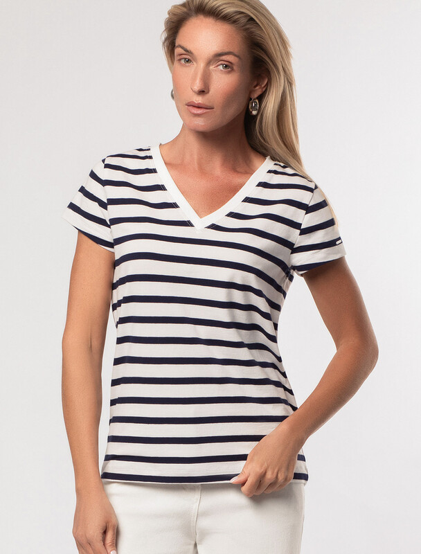 Футболка с V-образным вырезом выполнена из премиального хлопка. Добавление эластана в состав изделия способствует формоустойчивости. Самое высокое качество длинноволокнистых хлопковых волокон обеспечивает комфорт в любое время года. Изделие дополнено металлическим логотипом бренда.