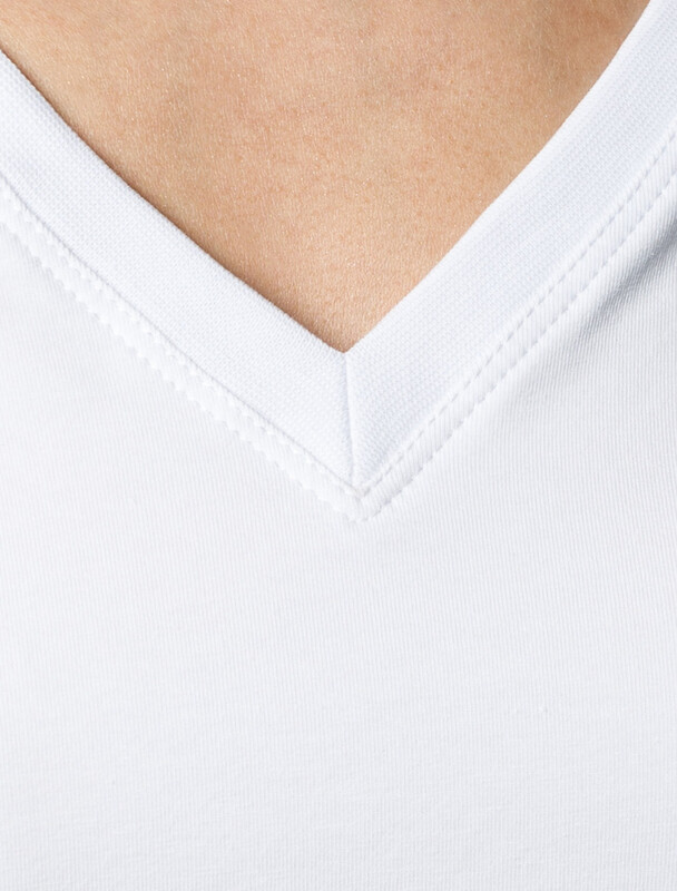 Однотонная футболка с V-образным вырезом выполнена из премиального хлопка. Добавление эластана в состав изделия способствует формоустойчивости. Самое высокое качество длинноволокнистых хлопковых волокон обеспечивает комфорт в любое время года.Универсальная базовая будет уместна не только в повседневном образе с денимом, но и в офисе с нестрогим дресс-кодом, в паре с брюками и жакетом.