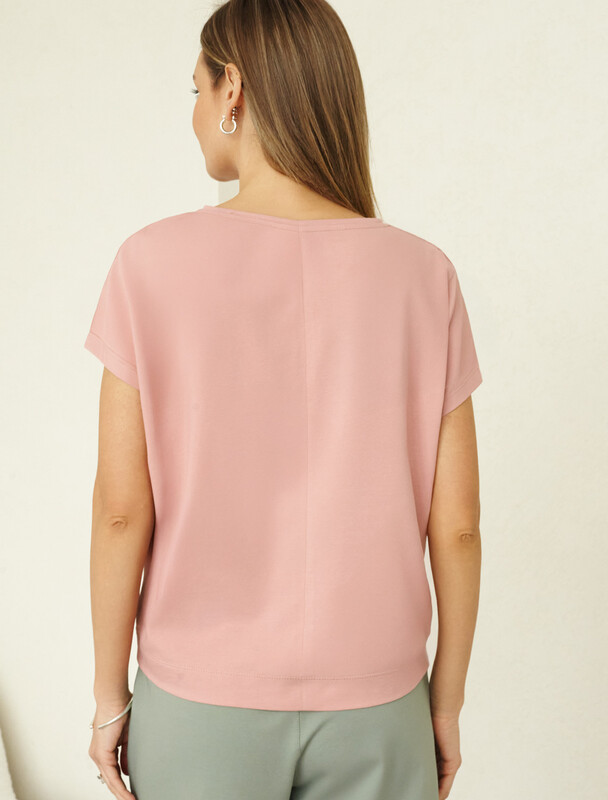 Футболка с цельнокроеным рукавом выполнена из премиального хлопка. Базовая однотонная модель идеально впишется в любой гардероб. V-вырез подчеркивает ключицы и удлиняет шею, хорошо сочетается с жакетами или кардиганами. Изделие дополнено металлическим логотипом бренда.