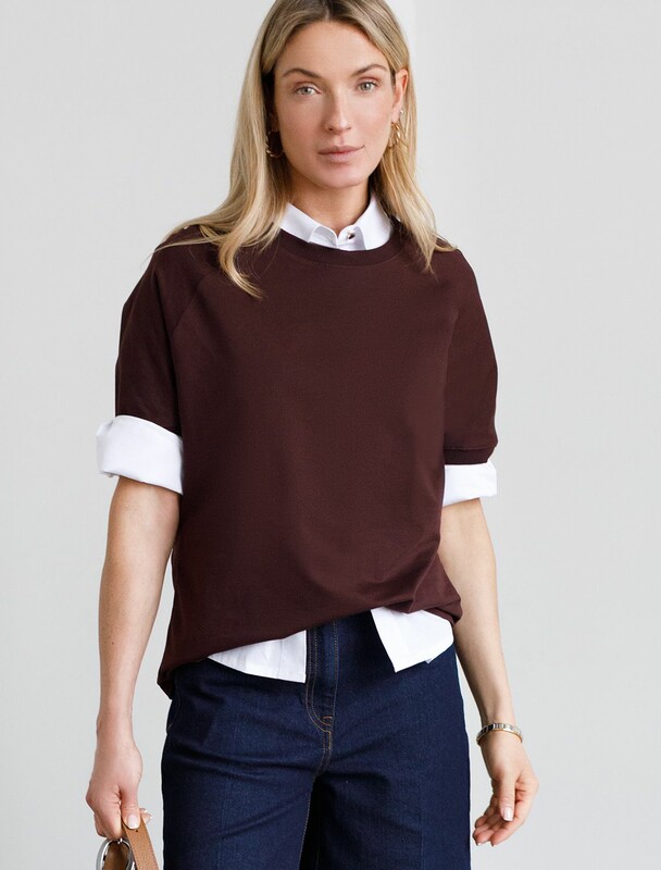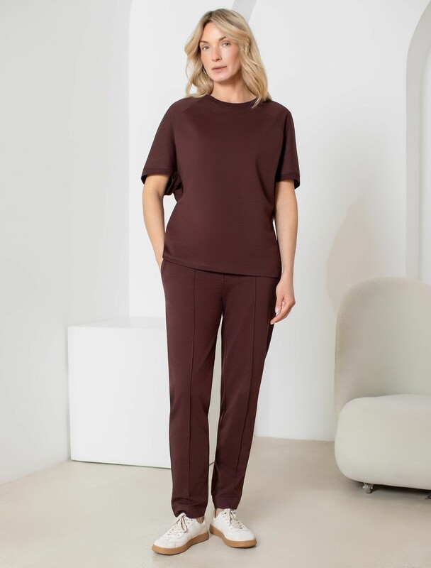 Футболка с рукавами регланами выполнена из эластичного футера двухнитки. Свободная модель со спущенной линией плеча легко поможет составить образы в расслабленном стиле. Сочетается в костюме с брюками D44.135, D44.136 и юбкой D46.034. Наличие эластана в составе изделия гарантирует абсолютный комфорт и формоустойчивость.
