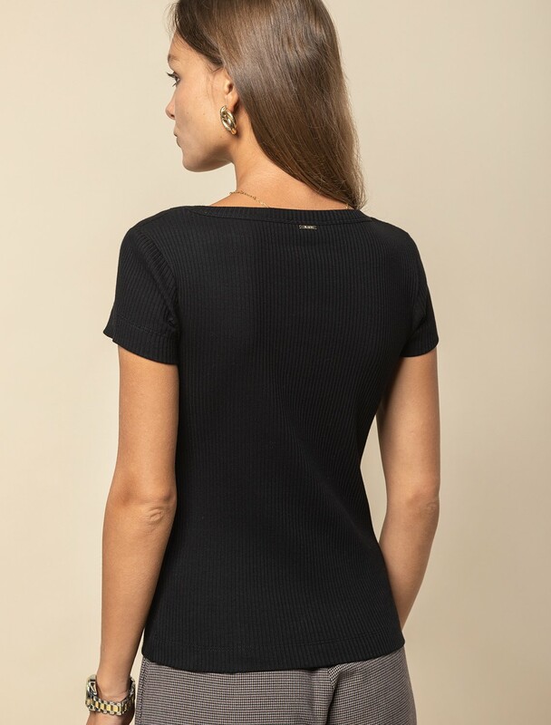 Футболка выполнена из трикотажа в широкий рубчик. Приятная к телу хлопковая ткань с гладкой трикотажной фактурой. Вырез каре подчеркивает изящество фигуры с акцентом на декольте и поддерживает силуэт. Лучшее решение для комплектов с акцентом на талию с объемными низами – палаццо, кюлотами или пышными юбками. Изделие украшено фирменным логотипом бренда.
