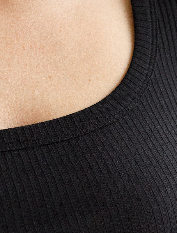 Футболка выполнена из трикотажа в широкий рубчик. Модель с круглым вырезом.  Эластичный хлопковый трикотаж сидит по фигуре, не сковывает движений и очень комфортный в носке. Фактура вертикальных полос визуально стройнит и вытягивает силуэт. Базовое изделие хорошо впишется в любой гардероб. Идеально подходит для многослойных образов.