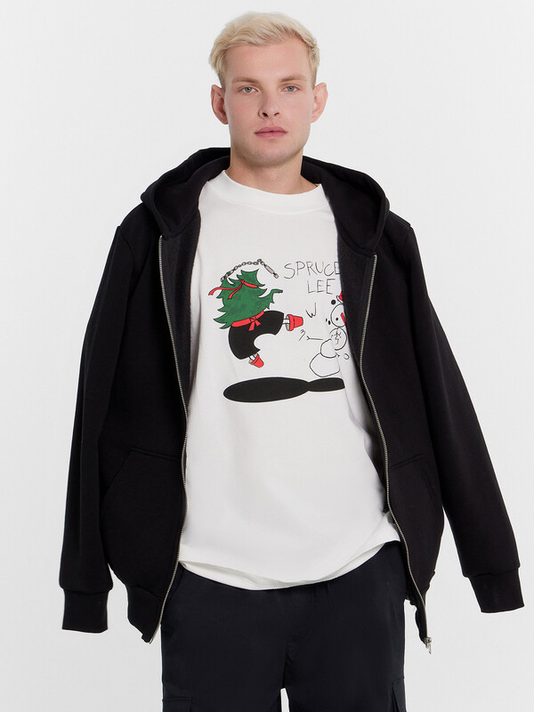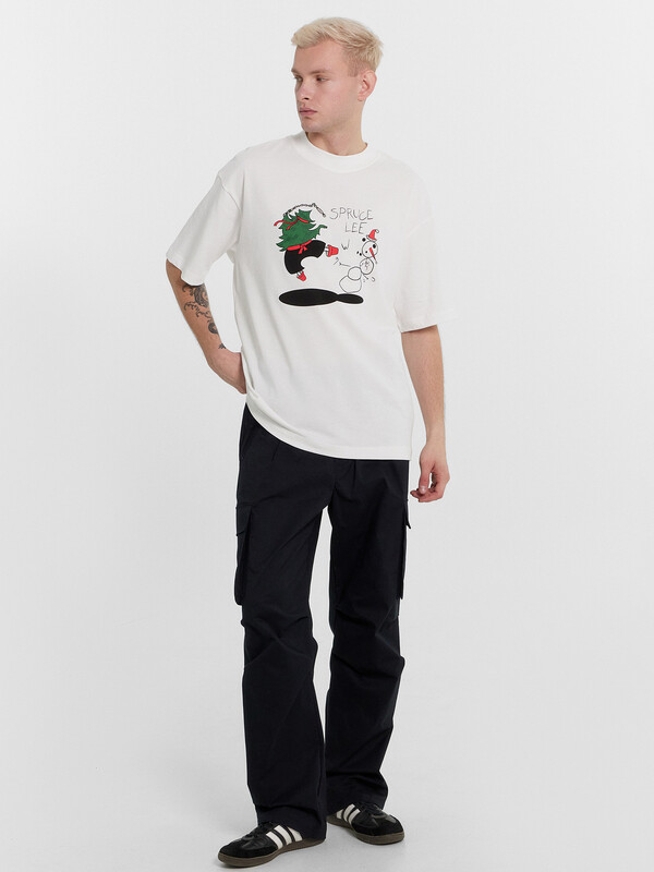 Нижние срезы футболки и рукавов обработаны швом вподгибку.