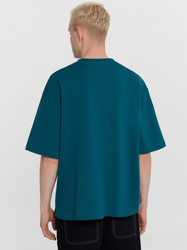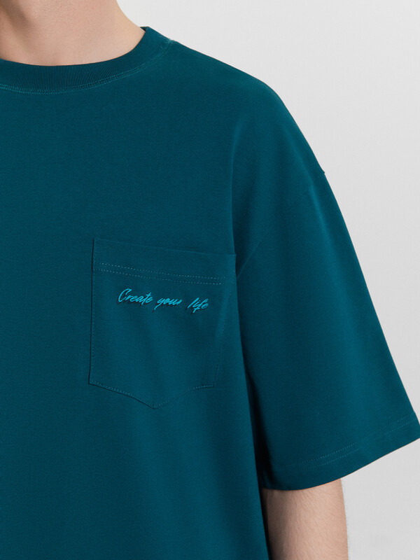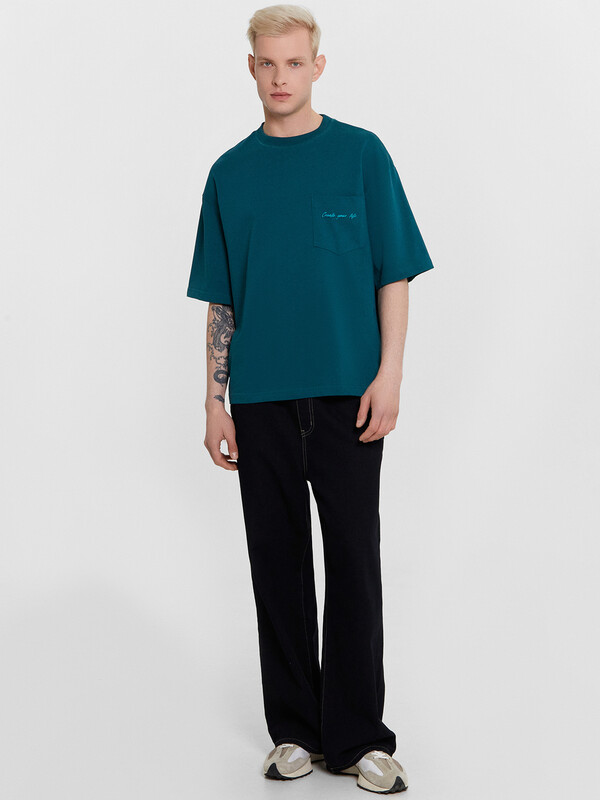 Футболка свободная укороченная, оверсайз. Горловина округлой формы обработана обтачкой из рибаны. Рукава втачные, корткие. Линия плеча спущена. На детали переда накладной карман (мод 111899-1). Нижние срезы футболки и рукавов обработаны швом вподгибку.