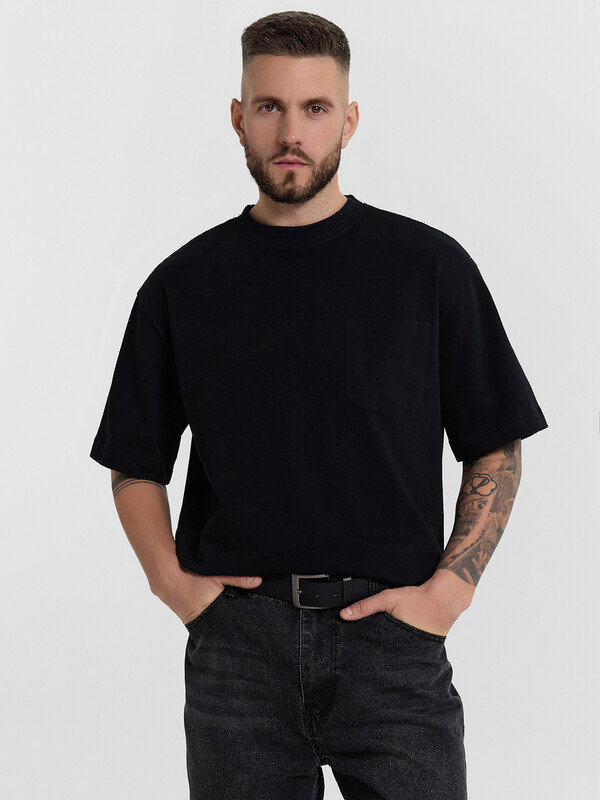Футболка свободная укороченная, оверсайз. Горловина округлой формы обработана обтачкой из рибаны. Рукава втачные, корткие. Линия плеча спущена. На детали переда накладной карман (мод 111899-1). Нижние срезы футболки и рукавов обработаны швом вподгибку.