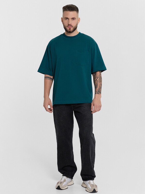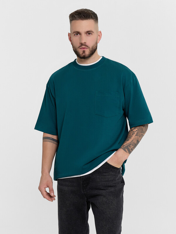 Футболка свободная укороченная, оверсайз. Горловина округлой формы обработана обтачкой из рибаны. Рукава втачные, корткие. Линия плеча спущена. На детали переда накладной карман (мод 111899-1). Нижние срезы футболки и рукавов обработаны швом вподгибку.