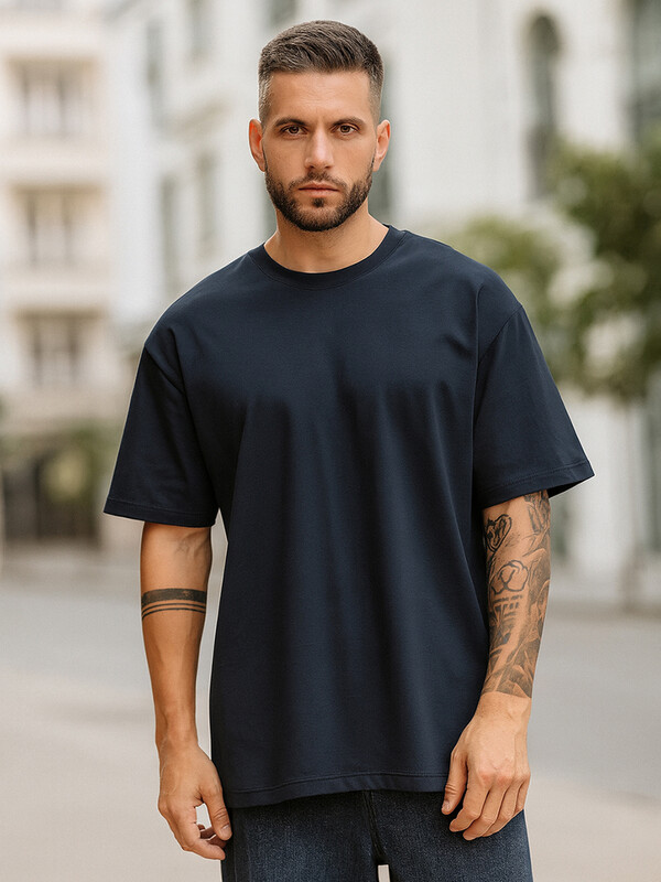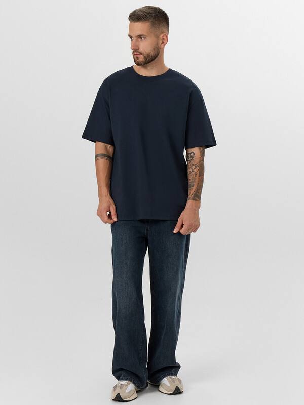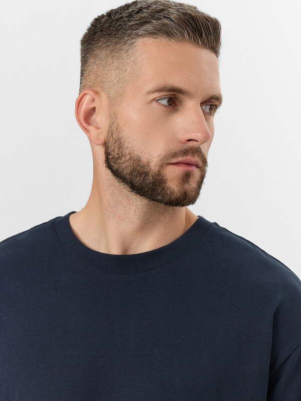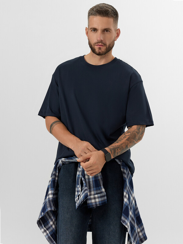 Футболка свободного силуэта. Перед и спинка цельнокроеные. Горловина круглой формы. Обтачка горловины из рибаны 1*1. По горловине проложена отделочная строчка. Горловина спинки закрыта тесьмой из основного полотна. Плечо спущено, пройма углублена. Рукав втачной, длина рукава чуть выше локтя.