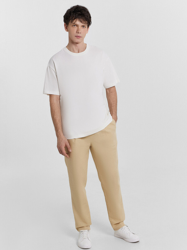 Футболка свободного силуэта. Перед и спинка цельнокроеные. Горловина круглой формы. Обтачка горловины из рибаны 1*1. По горловине проложена отделочная строчка. Горловина спинки закрыта тесьмой из основного полотна. Плечо спущено, пройма углублена. Рукав втачной, длина рукава чуть выше локтя.