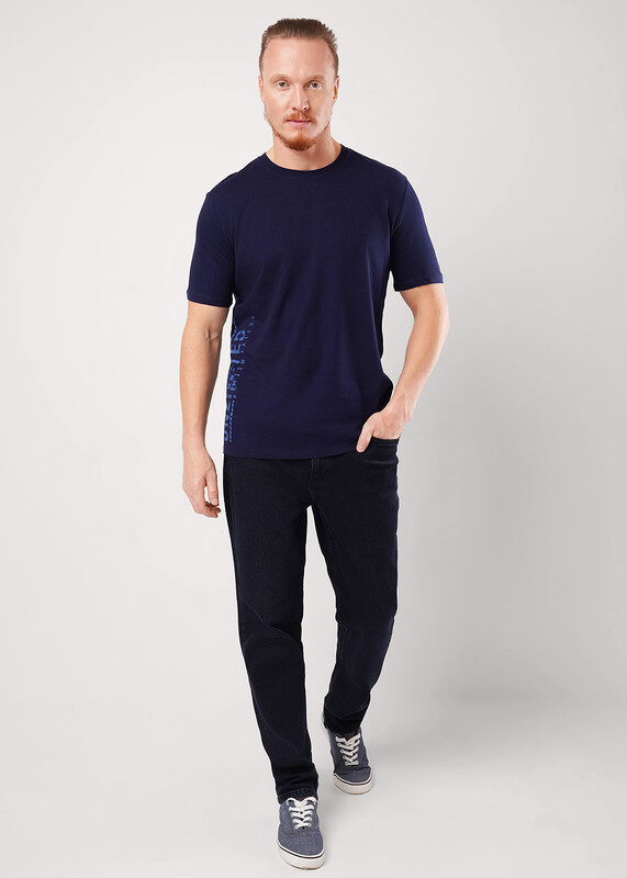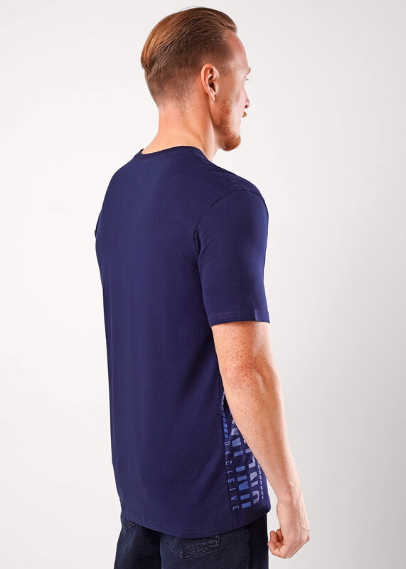 Фуфайка с коротким рукавом среднего объема, с оригинальным принтом, круглым вырезом горловины, которая оформлена обтачкой из рибаны.