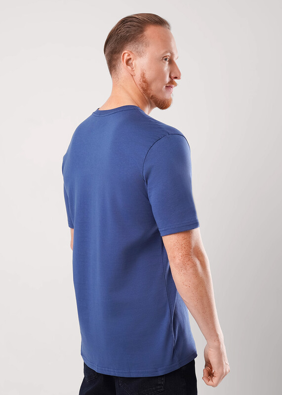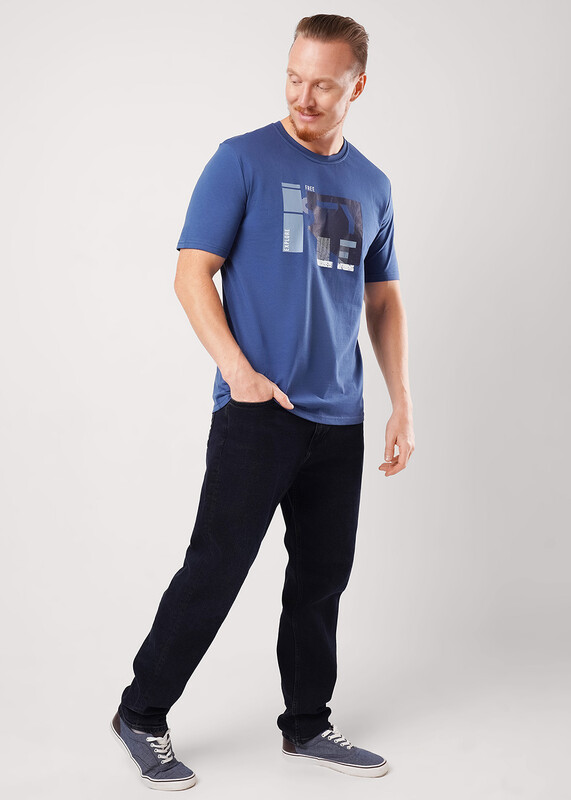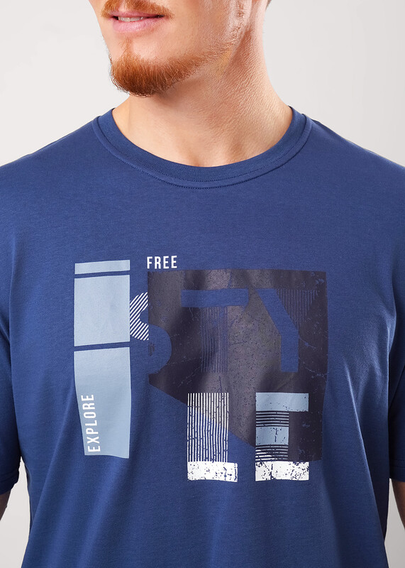 Фуфайка с коротким рукавом среднего объема, с оригинальным принтом, круглым вырезом горловины, которая оформлена обтачкой из рибаны.
