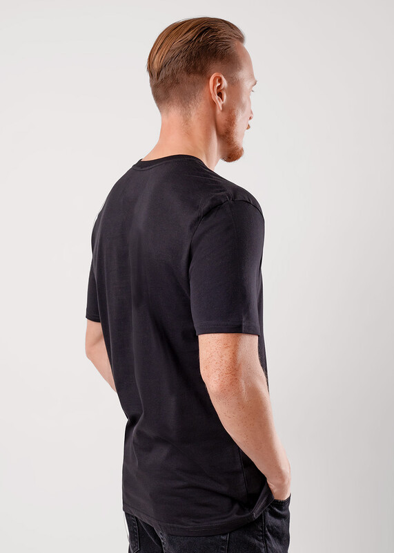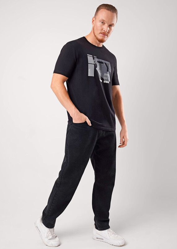 Фуфайка с коротким рукавом среднего объема, с оригинальным принтом, круглым вырезом горловины, которая оформлена обтачкой из рибаны.
