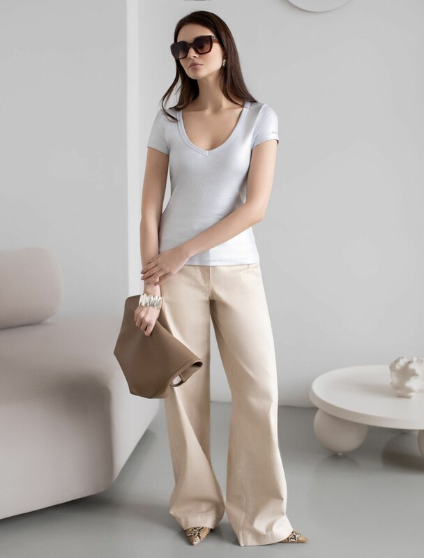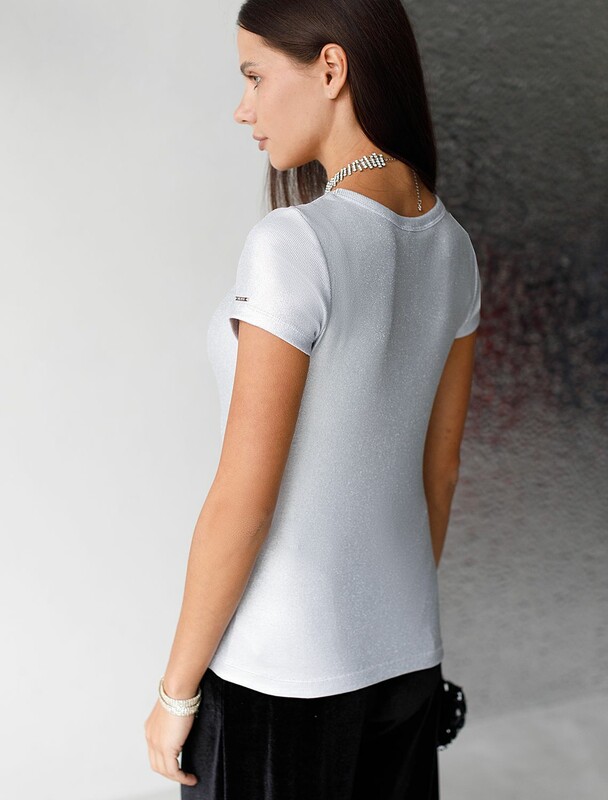 Повседневная футболка  универсальна: она сочетается с джинсами, юбками или строгими брюками — легко создать как деловой образ для офиса, так и наряд для вечеринки или ужина вне дома. Матовое покрытие создает благородный блеск без лишней яркости, благодаря чему футболка смотрится свежо и акту