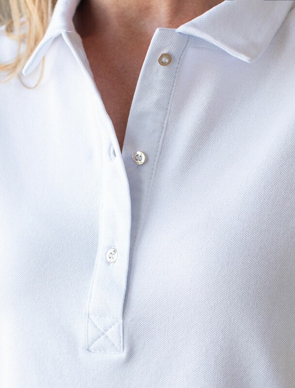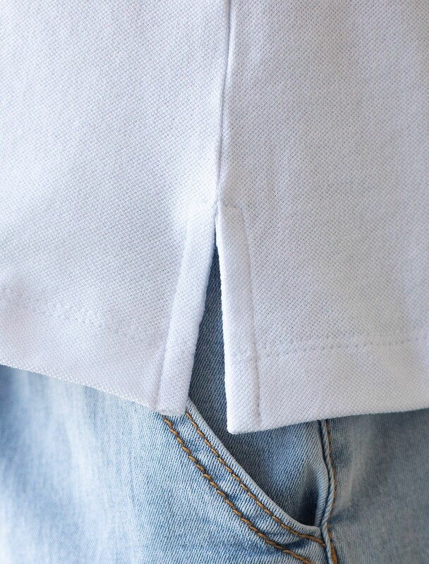 Футболка-поло полуприлегающего силуэта. Классическая модель из хлопка с эластаном с отложным вязаным воротником. Идеально впишется в повседневный гардероб. Застежка на пуговицы на планке.