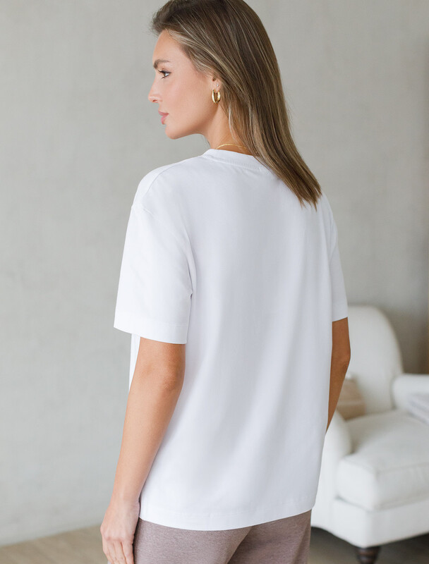 Свободный крой футболки дарит удобство и не стесняет движений, что делает ее идеальной для повседневной носки или активного отдыха, подчеркивает современный взгляд на моду. На рукаве металлический логотип бренда. Подойдет девушкам и женщинам на любую фигуру, вы будете чувствовать себя в ней уверенно и комфортно. Отлично впишется в гардероб благодаря универсальному дизайну, который легко сочетать с джинсами, шортами или спортивными брюками