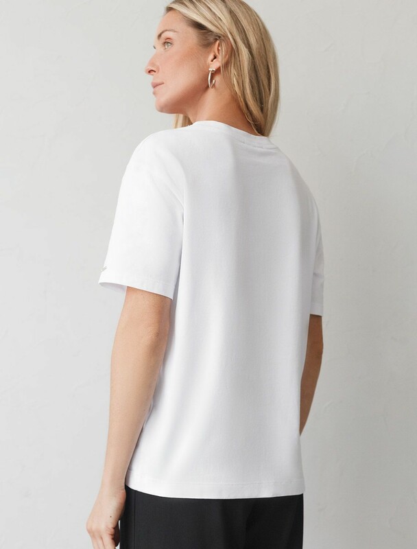 Свободный крой футболки дарит удобство и не стесняет движений, что делает ее идеальной для повседневной носки или активного отдыха, подчеркивает современный взгляд на моду. На рукаве металлический логотип бренда. Подойдет девушкам и женщинам на любую фигуру, вы будете чувствовать себя в ней уверенно и комфортно. Отлично впишется в гардероб благодаря универсальному дизайну, который легко сочетать с джинсами, шортами или спортивными брюками