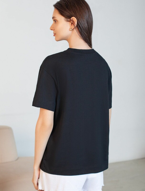 Футболка черного цвета изготовлена из премиального 100% хлопка, благодаря чему изделие приятно прилегает к телу, не вызывает дискомфорта и идеально подходит для чувствительной кожи.  Натуральный материал сохраняет форму и цвет после множества стирок, обеспечивая долговечность изделия, а его высокая воздухопроницаемость создает ощущение свежести даже в течение долгого дня. Особое внимание привлекает стильный принт контрастного цвета в виде тропических растений. Принт выполнен красками с устойчивым покрытием, который добавляет изделию оригинальности и позволяет выразить индивидуальность. Свободный крой футболки дарит удобство и не стесняет движений, что делает ее идеальной для повседневной носки или активного отдыха, подчеркивает современный взгляд на моду. Подойдет девушкам и женщинам на любую фигуру, вы будете чувствовать себя в ней уверенно и комфортно. Лаконичный современный принт делает изделие универсальным: можно создавать стильные образы для прогулок, встреч, занятий спортом и домашних дел. Базовая футб