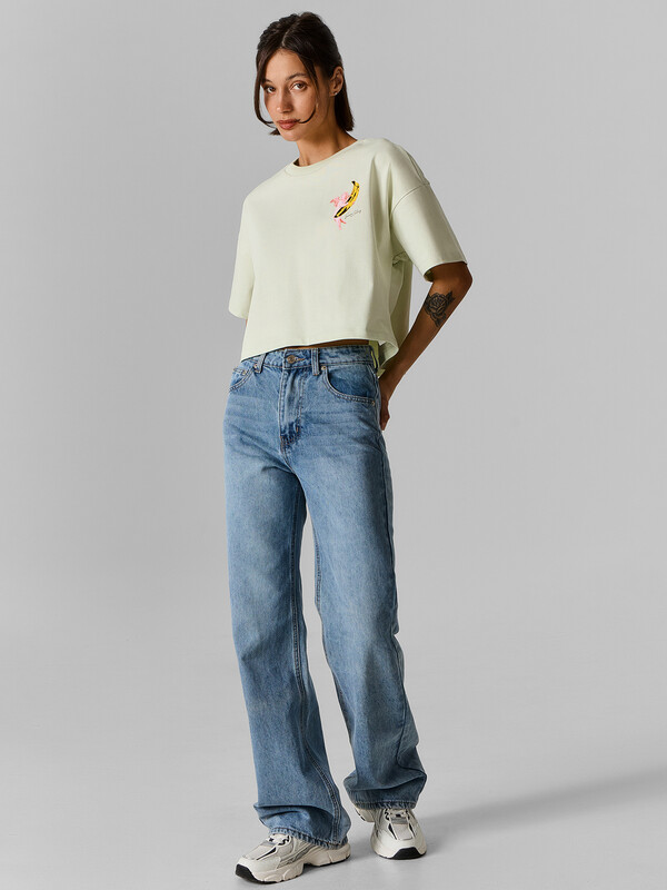 Укороченная хлопковая футболка из полотна кулирка. Силуэт свободный, оверсайз. Горловина круглой формы. Плечо спущено, пройма углублена – это делает движения максимально комфортными. Рукава длиной до локтя или чуть выше. Стильная модель!