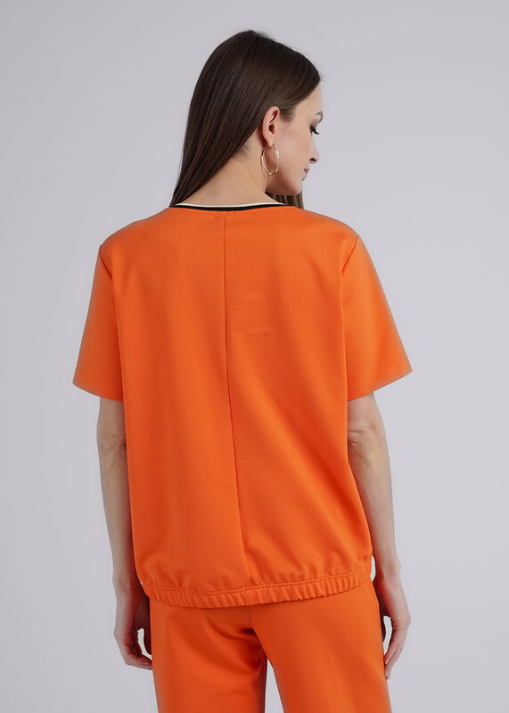 Джемпер из трикотажного полотна футер 2-х нит. Свободного прямого кроя. Втачной короткий рукав. Округлая горловина с вязаной обтачкой. По низу изделия спинки подгибка с внутренней резинкой. Спереди принт.