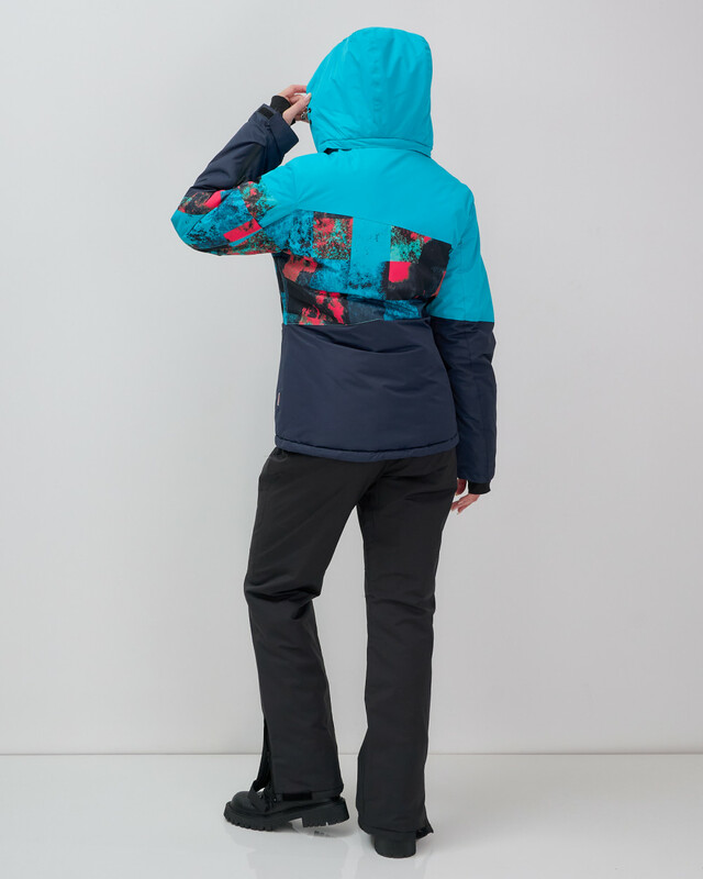 Яркие цвета — красный, зеленый, розовый, бирюзовый и салатовый — в сочетании с абстрактным геометрическим рисунком и светоотражающими деталями создают стильный образ, который выделит вас на фоне зимних пейзажей. Этот костюм идеально подходит как для спортивных мероприятий, так и для повседневных прогулок по городу.