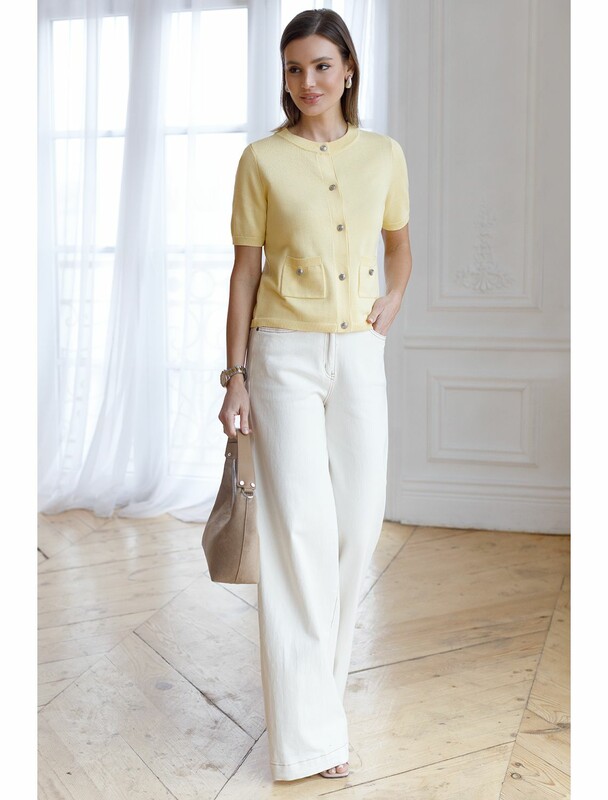 Вязаный кардиган светло-желтого цвета из хлопка с коротким рукавом — отличный выбор для весны и лета. Его женственный крой подчеркивает фигуру, а полуприлегающий силуэт создает аккуратный и стильный образ. Укороченный фасон гармонично сочетается с различными вариантами одежды, позволяя создавать как повседневные в стиле old money, так и более нарядные комплекты. Модель выполнена на пуговицах, что добавляет удобства при носке и делает жакет практичным для разных случаев.