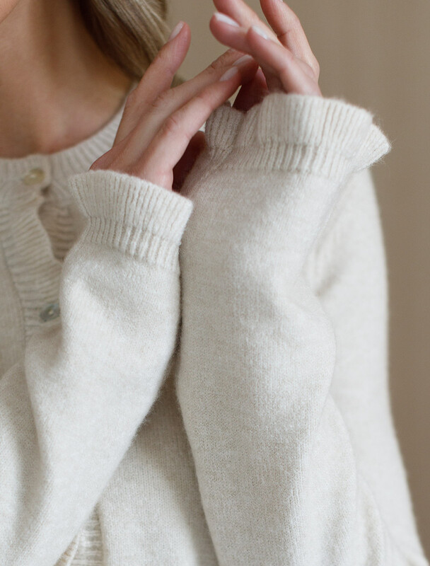 Кардиган выполнен из мягкой меланжевой пряжи с Романтичности прямому силуэту добавляют мягкие воланы по линии пуговиц, на манжетах и краю изделия. Застежка на пуговицы из натурального перламутра. Изделие очень приятное к телу, совершенно не колется и отлично сохраняет тепло. Сочетается в костюме с брюками D38.013, D38.012 и юбкой D36.016