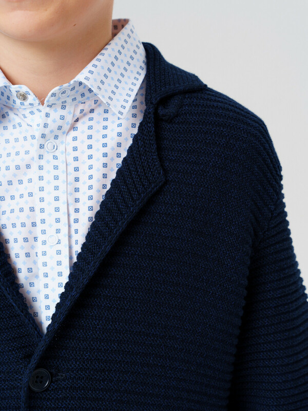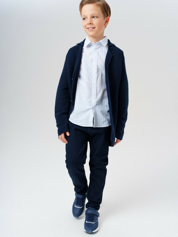 Этот модный кардиган для школы с нестандартным дизайном станет универсальным элементом гардероба юного стиляги. Модель выполнена в базовом силуэте – классический крой обеспечивает комфорт в движении и современный внешний вид.