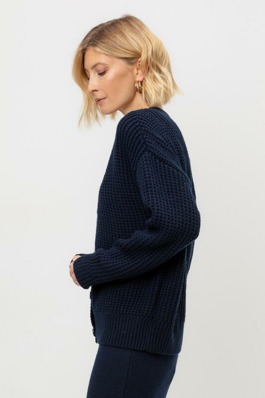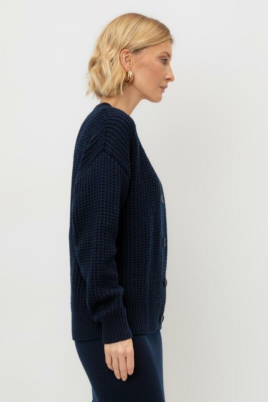 Вязаный кардиган на пуговицах из шерсти с добавлением акрила. Ажурная вязка, манжеты и нижний край не растянутся благодаря вывязанной резинке.