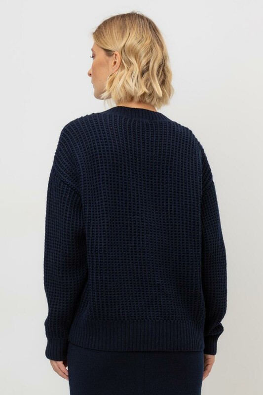 Выполнен из мягкой полушерстяной пряжи. Шерсть мериноса в составе сохраняет тепло, акрил делает изделие мягким. Прямой силуэт идеально подходит как к юбке, так и к брюкам.