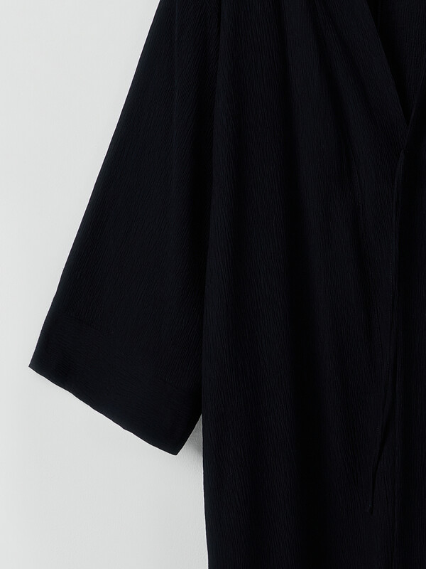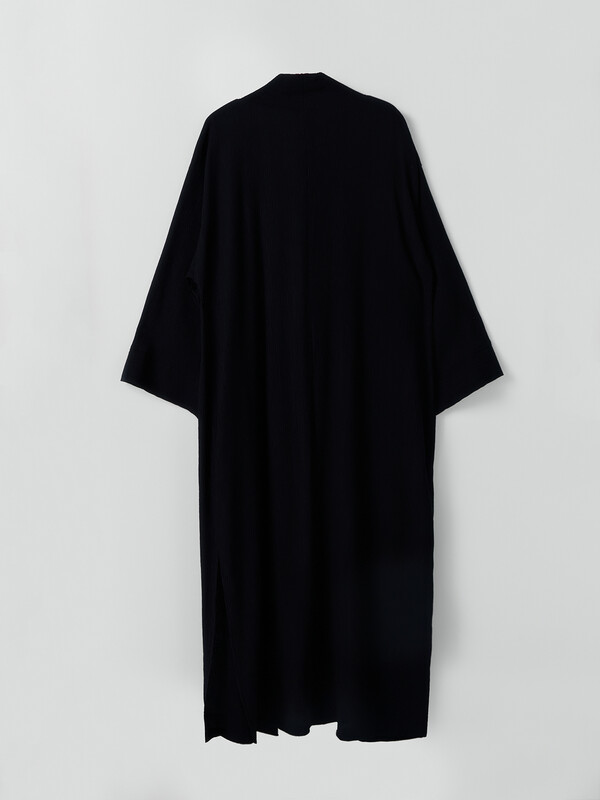 Кардиган свободного силуэта, прямой. Рукава длинные, втачные, с манжетами. Горловина обработана отрезной планкой. Спереди завязка из основного полотна. По спинке центральный шов. По бокам разрезы. Низ вподгибку.