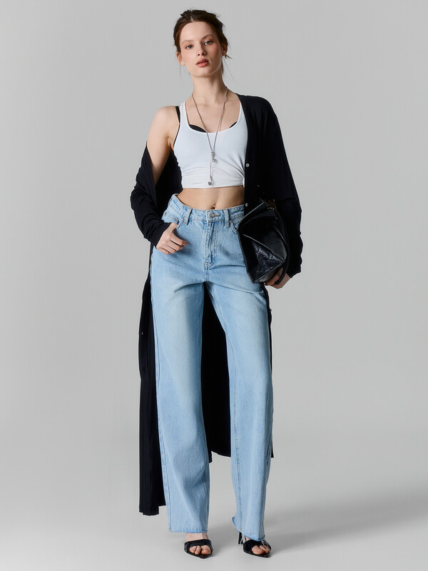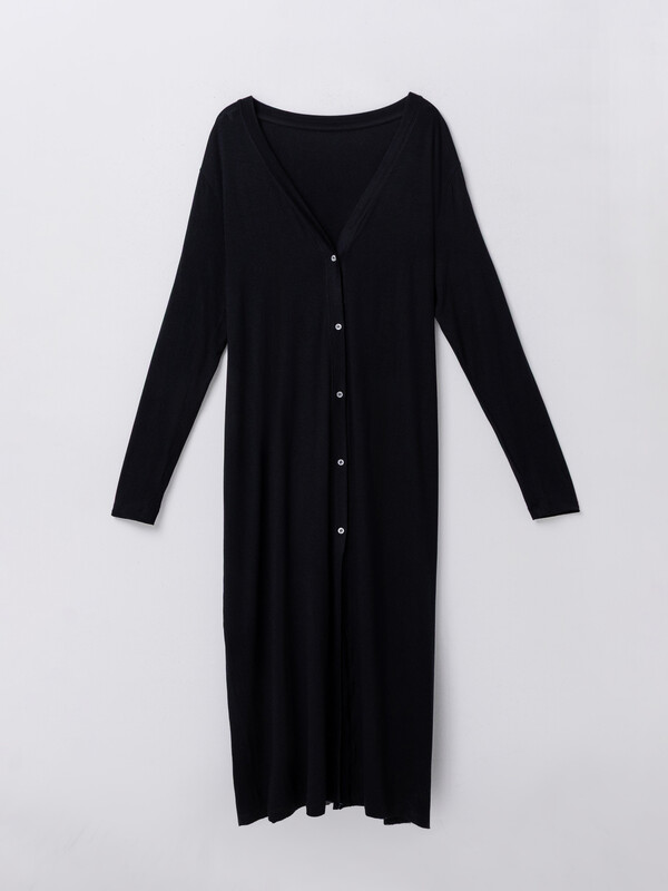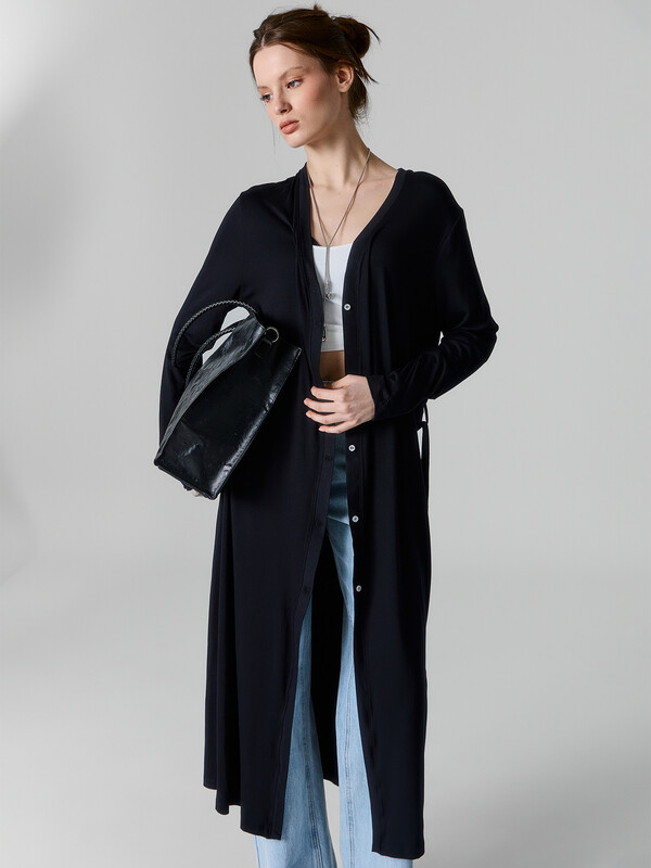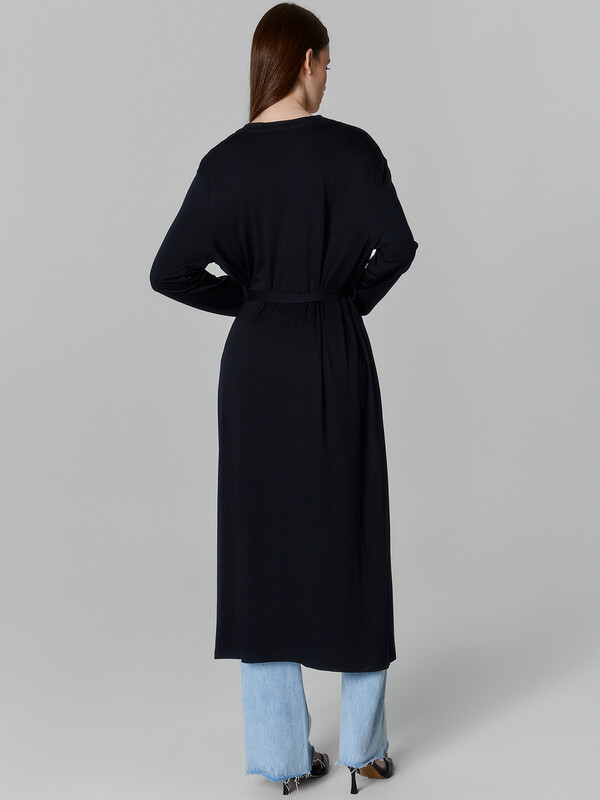 Кардиган свободного силуэта, с поясом и петельками из основного полотна. Плечо спущено, рукав втачной, длинный.