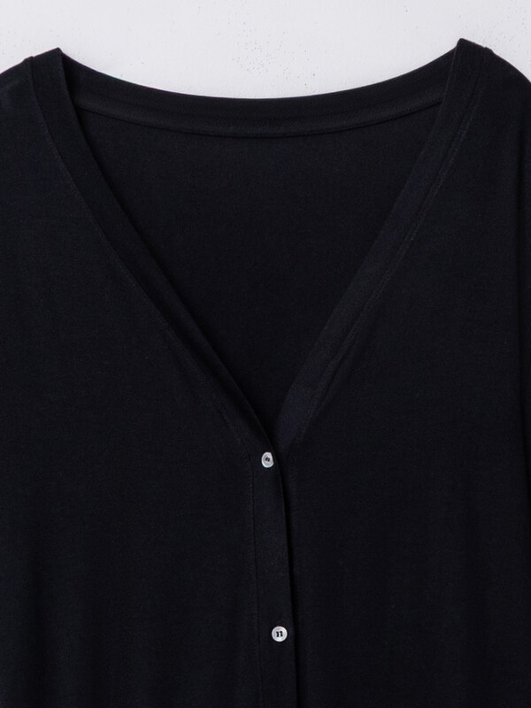 Горловина V-образной формы, обработана обтачкой из основного полотна. По переду планка из основного полотна с пуговицами 10-12 мм (по заданию). Нижние срезы обработаны швом вподгибку.