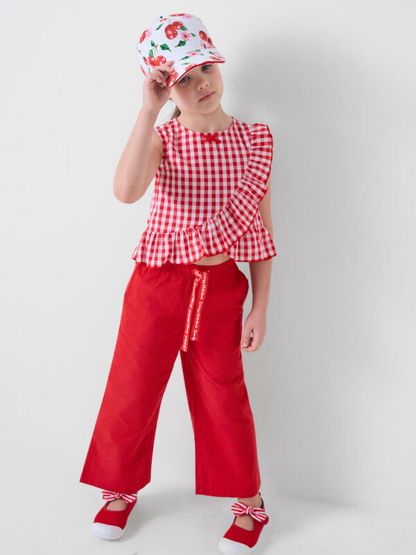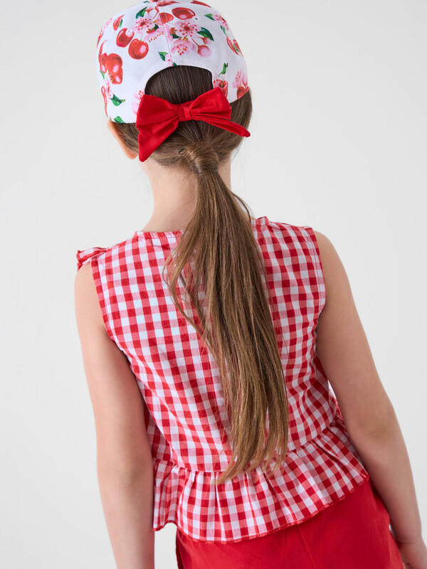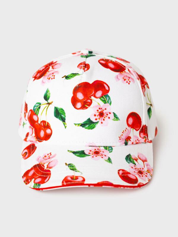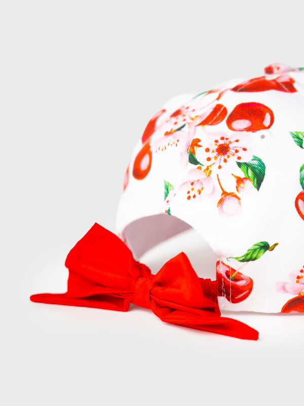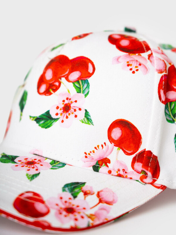 Лёгкая и яркая детская бейсболка для девочки. Выполнена из хлопкового текстиля с красочным принтом: вишни, листья и цветы. Козырёк изогнутый. Сзади — мягкая эластичная резинка, скрытая эффектной красной лентой с бантом. Есть вышитые вентиляционные отверстия.