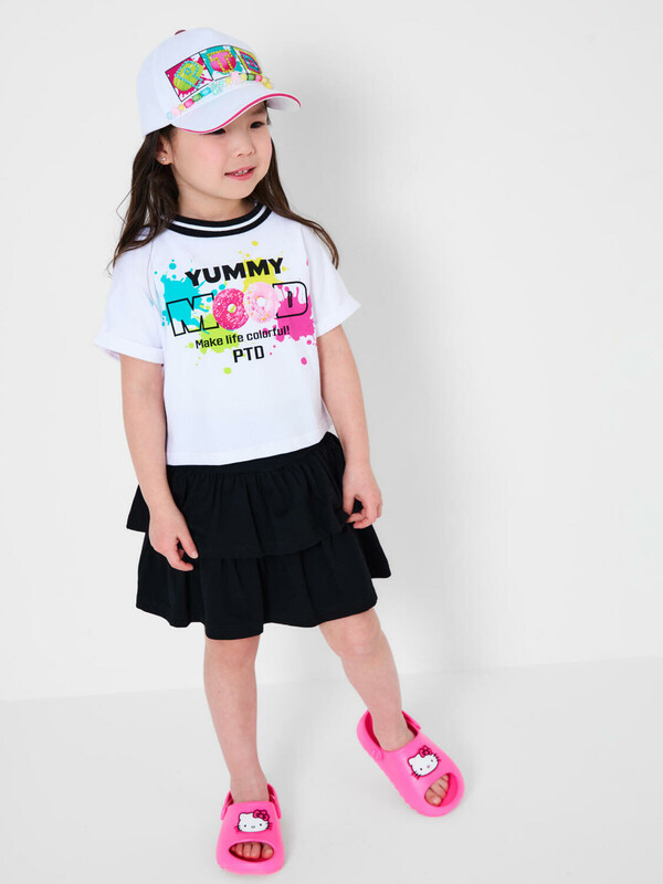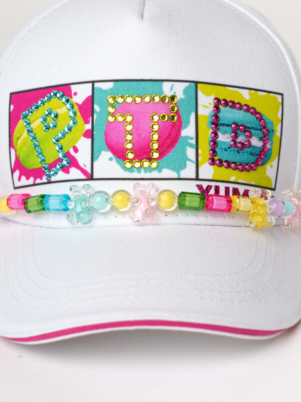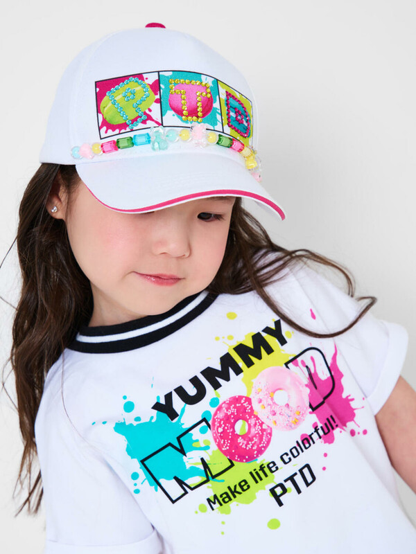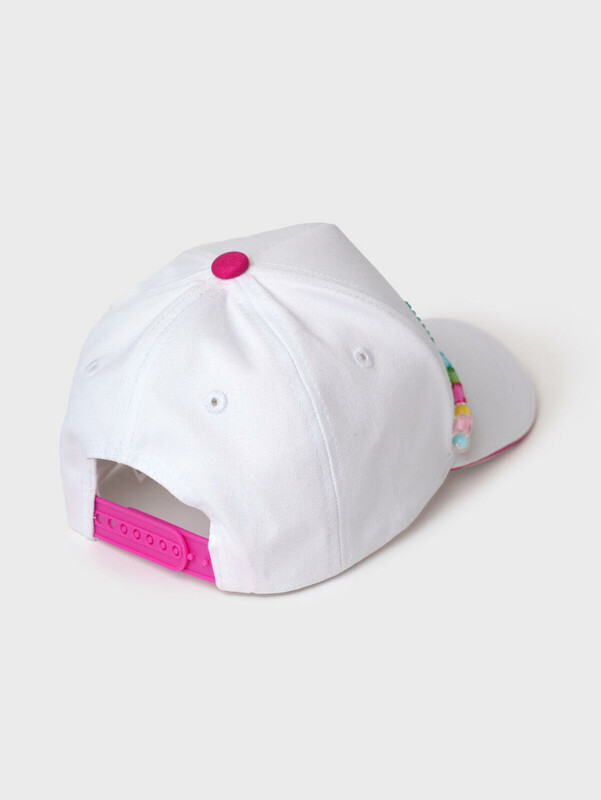Стильная детская бейсболка для девочки. Выполнена из хлопковой ткани с классическим изогнутым козырьком. По линии шва козырька добавлена лента из разноцветных бусин, которая придаёт изделию оригинальность. Сзади — пластиковая застежка на кнопках для регулировки размера.