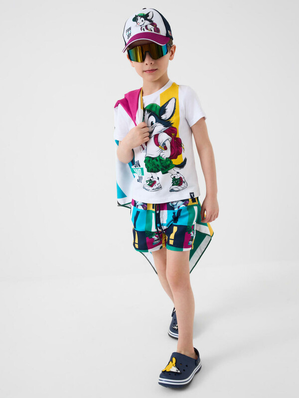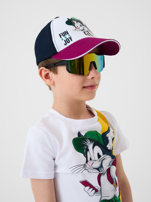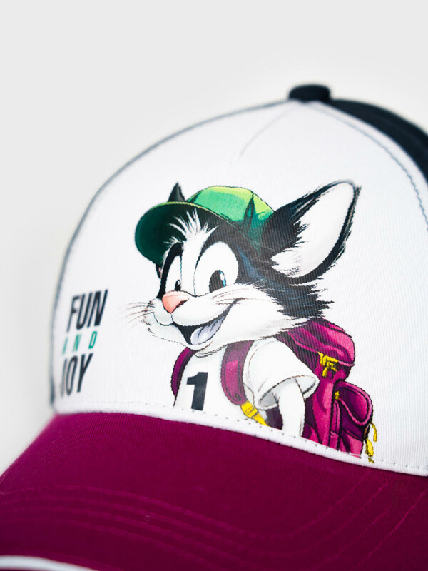 Детская бейсболка для мальчика. Козырёк — изогнутый с белой окантовкой и чёрной декоративной строчкой. Застёжка на липучке позволяет регулировать размер. Бейсболка дополнена вентиляционными отверстиями.