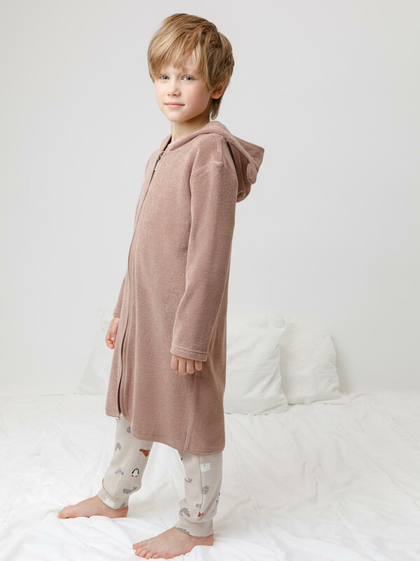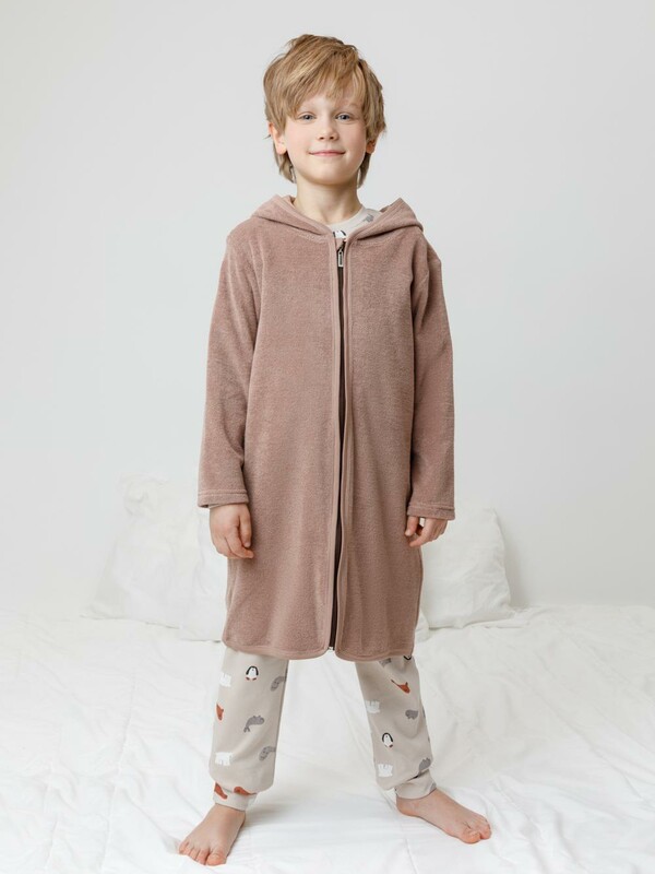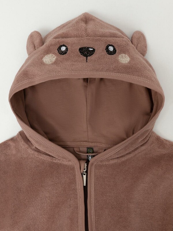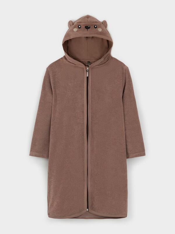 Халат на молнии с капюшоном. Изготовлен из мягкого махрового полотна, произведённого из натурального хлопка. В капюшоне подклад из высококачественного гладкого трикотажа супрем. Изделие украшено вышивкой и декоративными ушками. Края обработаны эластичным кантом. Все трикотажные полотна производятся в соответствии с нормами швейцарского сертификата ЭкоТекс.
