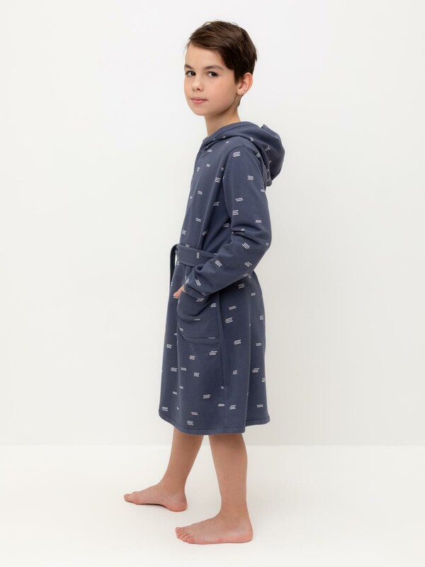 Халат с тонким капюшоном. Изготовлен из набивного хлопкового трикотажа футер петля. С помощью пояса можно регулировать посадку по фигуре. Сверху застёжка на кнопку. Края изделия обработаны мягким кантом. На боку накладной карман, уходящий в шов. Оригинальная набивка выполнена из стойких гипоаллергенных текстильных красителей. Все трикотажные полотна производятся в соответствии с нормами швейцарского сертификата ЭкоТекс.