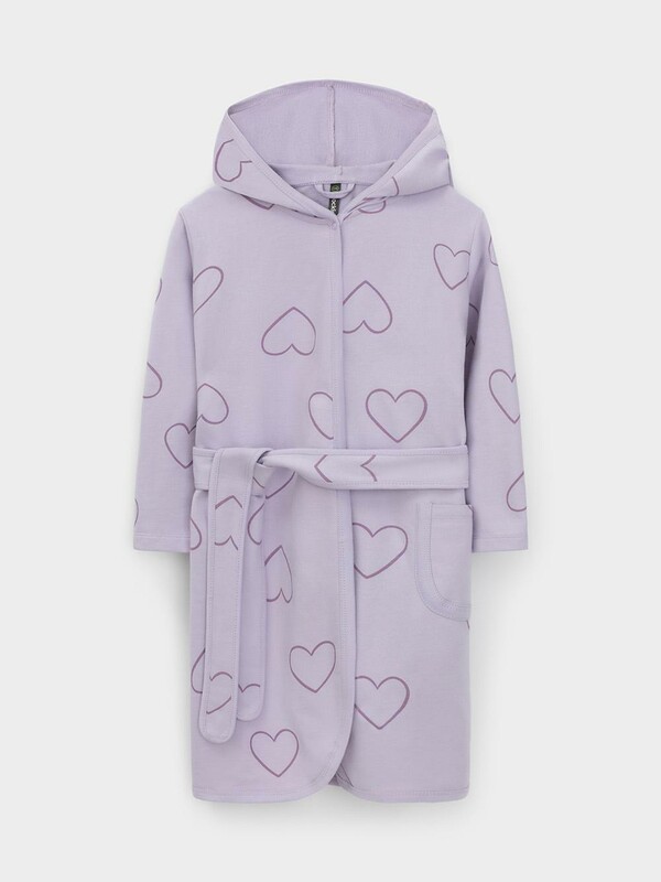 Халат с тонким капюшоном. Изготовлен из набивного хлопкового трикотажа футер петля. С помощью пояса можно регулировать посадку по фигуре. Сверху застёжка на кнопку. Края изделия обработаны мягким кантом. На боку накладной карман, уходящий в шов. Оригинальная набивка выполнена из стойких гипоаллергенных текстильных красителей. Все трикотажные полотна производятся в соответствии с нормами швейцарского сертификата ЭкоТекс.