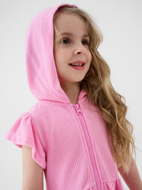 Детский махровый халат на молнии для девочки. Выполненный из мягкой хлопковой трикотажной ткани. Капюшон, короткие рукава с оборками и расклешённый низ. Центральная застёжка-молния делает халат удобным для повседневного использования. Светлый розовый цвет в белую полоску.