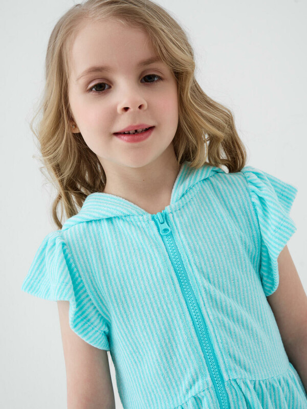Детский махровый халат на молнии для девочки. Выполненный из мягкой хлопковой трикотажной ткани. Капюшон, короткие рукава с оборками и расклешённый низ. Центральная застёжка-молния делает халат удобным для повседневного использования. Светлый мятный цвет в белую полоску.