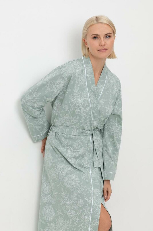 Уютный легкий халат из набивного трикотажа на запах с длинными рукавами. В боковых швах два удобных кармана. С помощью пояса можно регулировать посадку и силуэт. Гладкий материал приятен к телу и позволяет коже дышать.