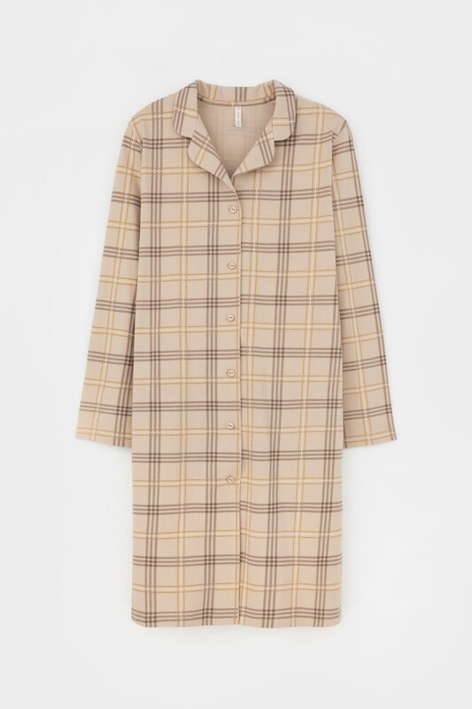 Рубашка-халат с длинными рукавами на пуговицах из набивного трикотажа. Гладкий материал приятен к телу и позволяет коже дышать.