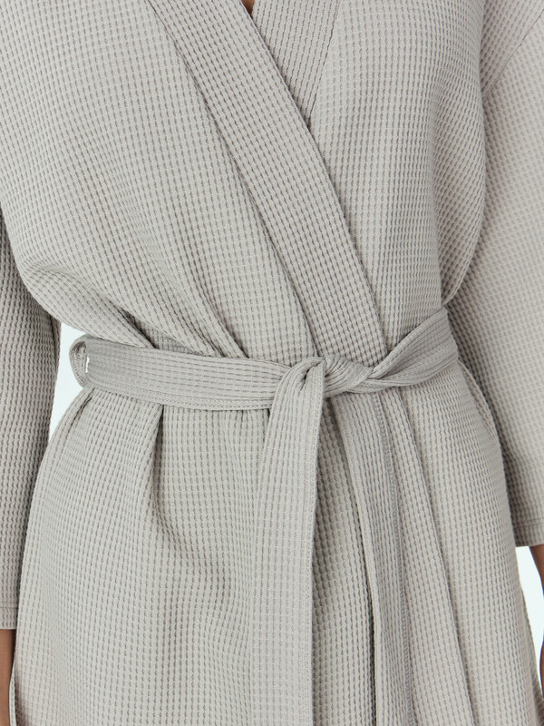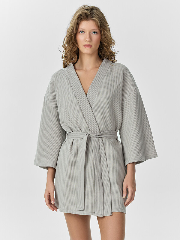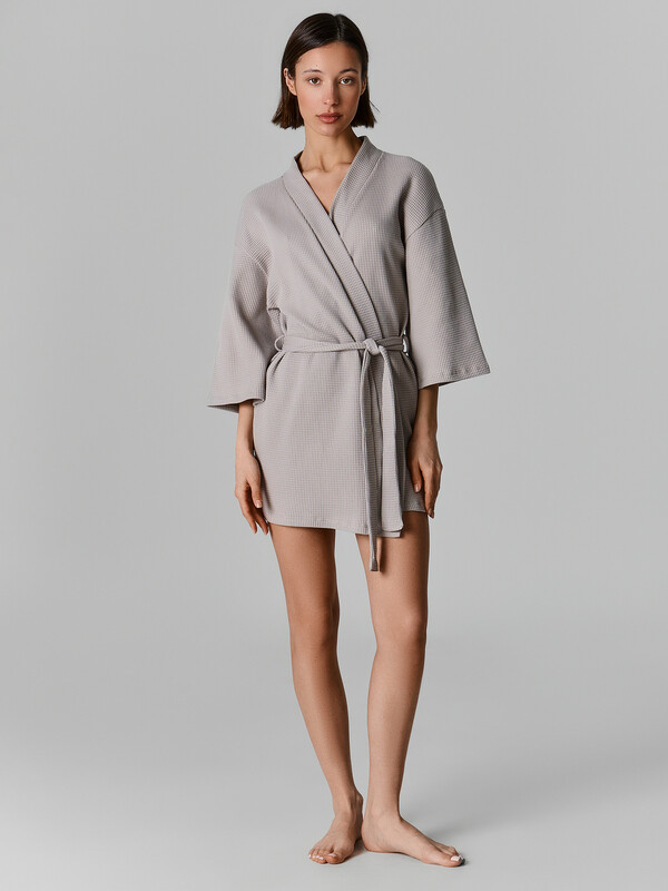 Халат прямого силуэта, укороченный. Спинка цельнокроеная. Халат с запахом, со съемным поясом, продетым в шлевки в боковых швах. Концы пояса свободно завязываются. Рукава чуть укороченные. По срезам борта и горловины притачена планка. Нижние срезы рукавов и халата подложены.