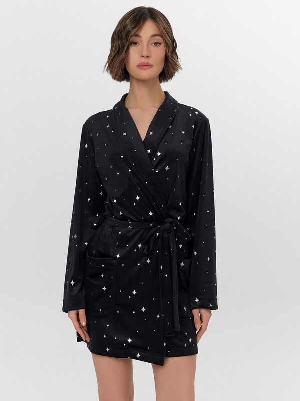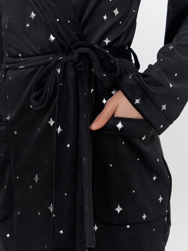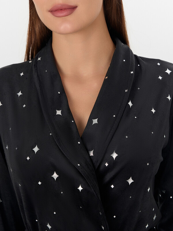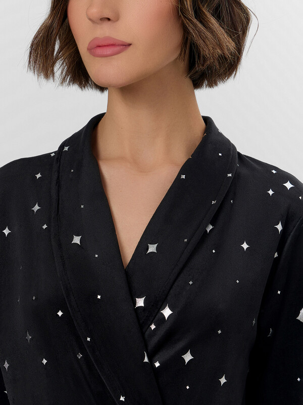 Особый шарм халату придают завязки из тесьмы на уровне талии и декоративный пояс, продетый в шлевки. Практичные накладные карманы с закругленным низом дополняют образ. Звездный узор и глубокий черный цвет делают эту модель стильным элементом домашнего гардероба, который подарит ощущение комфорта в течение вечера.
