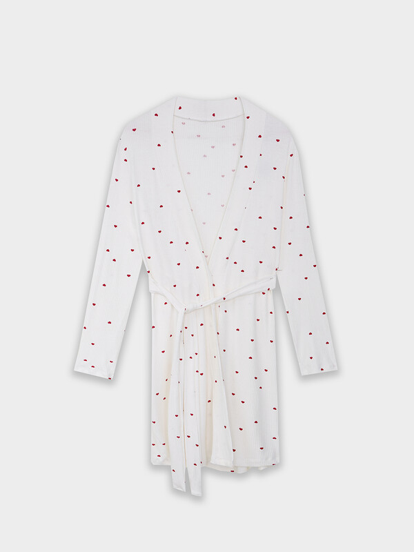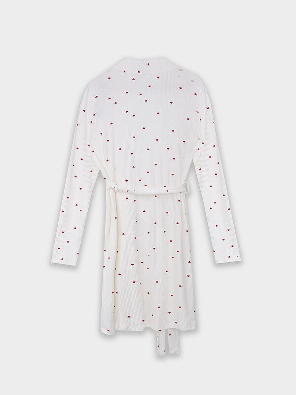 Халат прямой, короткий. Горловина V-образной формы. Рукава втачные длинные. По боковым швам в районе талии настрочены шлевки и вставлен пояс из основного полотна. На уровне талии притачаны завязки из основного полотна для фиксации полы халата. Срезы борта и горловины обработаны обтачками. Нижние срезы халата и рукавов обработаны швом вподгибку.