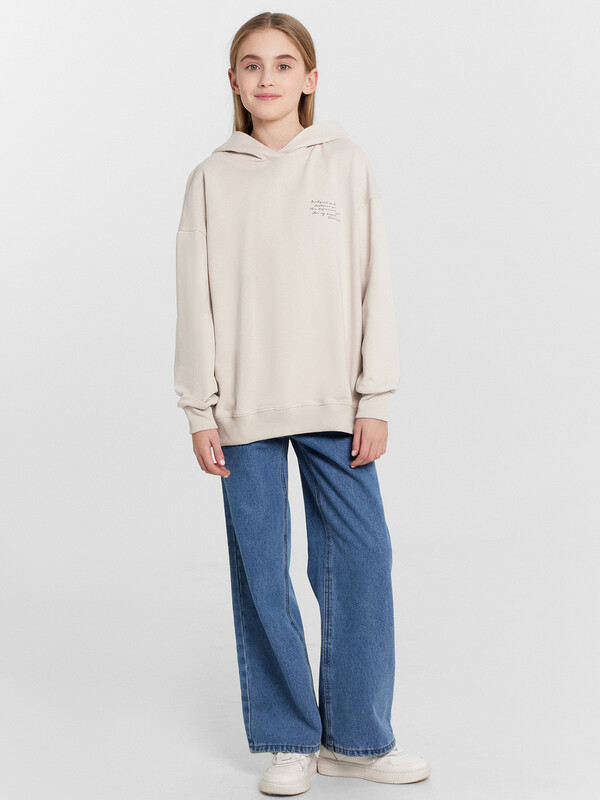 Стильное худи оверсайз для девочек, созданное из трикотажного футера с теплым подчесом. Такой материал обеспечивает мягкость, комфорт и тепло, делая эту модель идеальным выбором для прохладных дней. Крой с комфортным капюшоном и длинными рукавами с манжетами сочетает в себе практичность и стиль. Спущенная линия плеча дарит дополнительную свободу движений и комфорт, делая это худи еще более уютным.