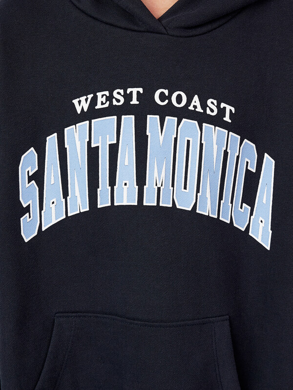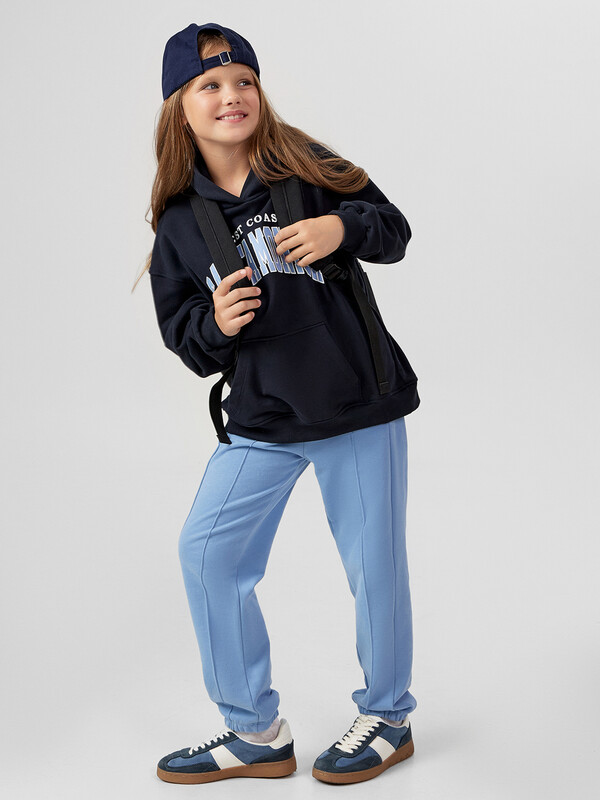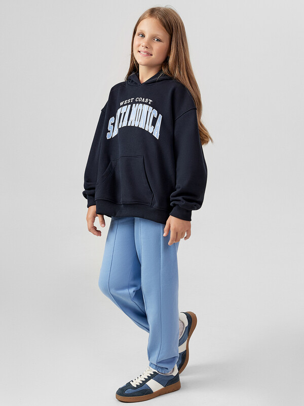 Худи для девочек, свободного силуэта (оверсайз), с капюшоном. Горловина округлой формы. Капюшон со средним швом, на подкладке из основного полотна. Шов втачивания капюшона закрыт хб тесьмой. Плечо спущено, рукав втачной длинный. По низу рукава отрезная манжета из рибаны. Пояс отрезной из рибаны, отстрочен. По переду карман кенгуру.