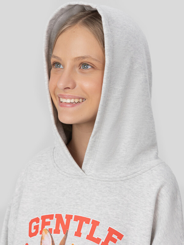 Худи укороченный прямого силуэта с капюшоном. Рукава длинные, втачные.